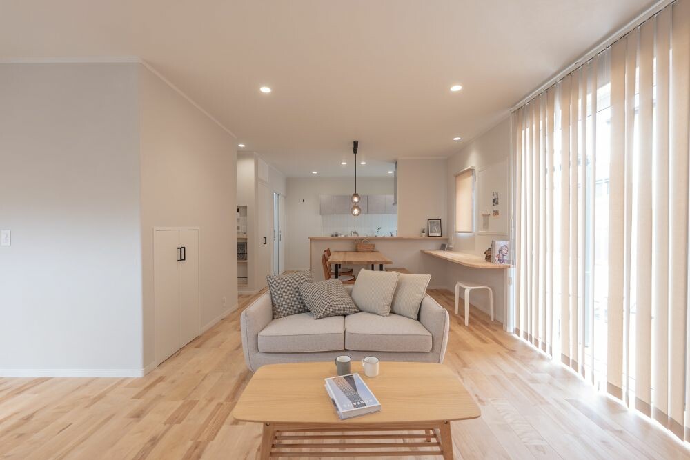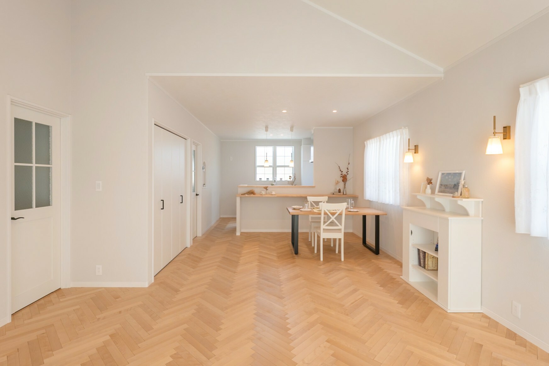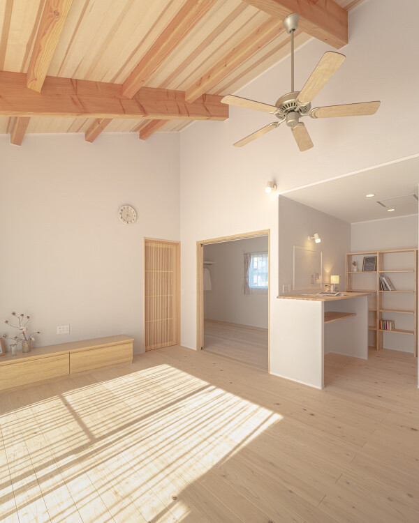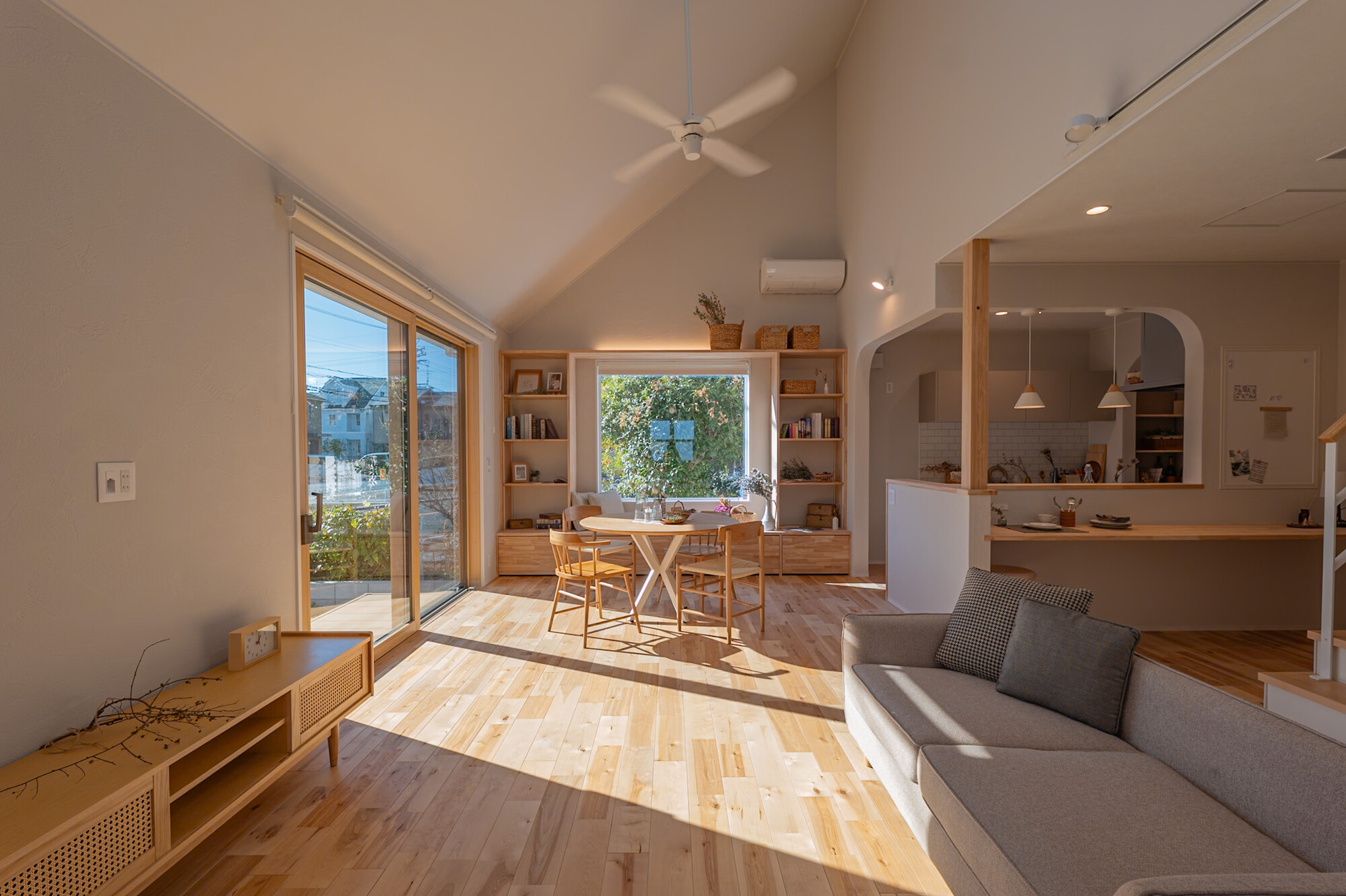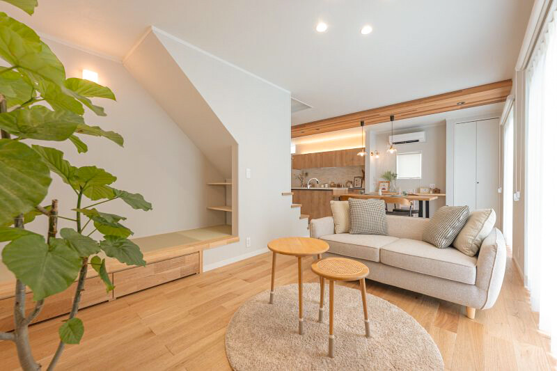 浜松市にあるモデルハウス「Kinari」は、無垢の床や塗り壁など、自然素材や木のぬくもりを存分に感じられる内装デザインが特徴です。大きな窓から光が差し込む、明るく開放的な吹き抜け空間。断熱・気密・遮音性にもこだわり、断熱等級6(G2)の快適な住環境をご体感いただけます。