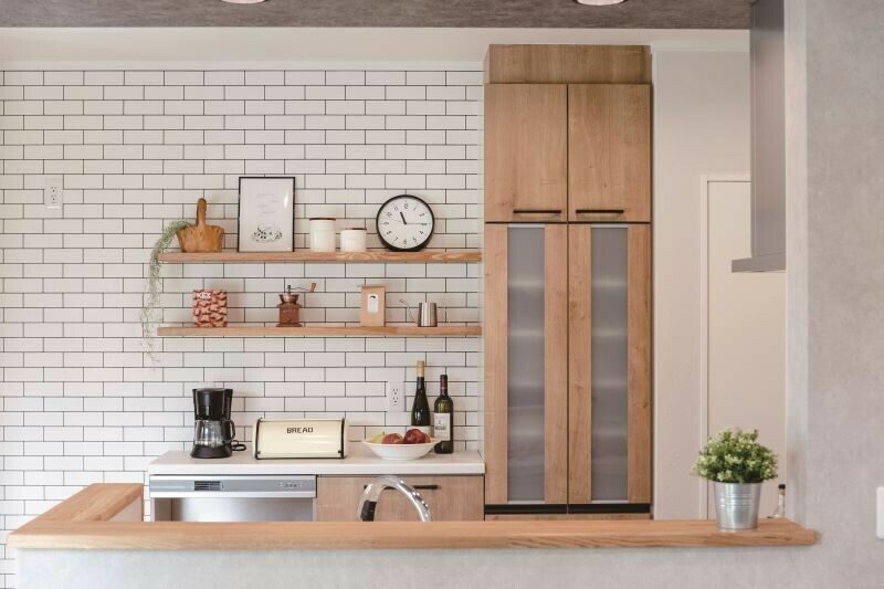 新築でおしゃれなキッチンを作る要素は様々。中でもとりわけ人気な仕様は「ウォールシェルフ」。木材の種類を選ばなければ低コストででき、適当に物を置くだけでもおしゃれな仕上がるため人気があります。そこで施工事例を参考に棚板の取り付け位置など、どういう風に仕上げているかを見てみましょう。