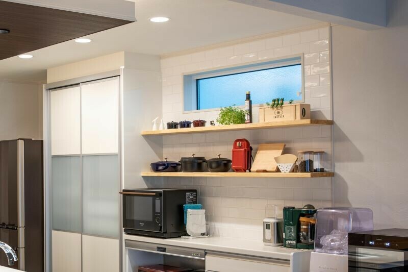 ロングのウォールシェルフ1段のパターンです。上部の横すべり窓とのバランスを意識するのがポイント。1段だけというのは、家電類をカウンターへ置きたいという方におすすめです。高さのある電子レンジからミキサーまでゆとりを持って設置できます。