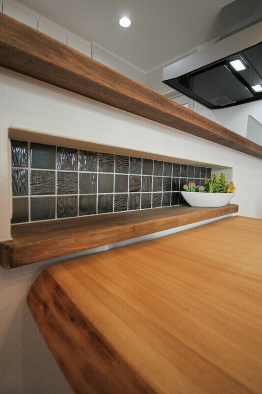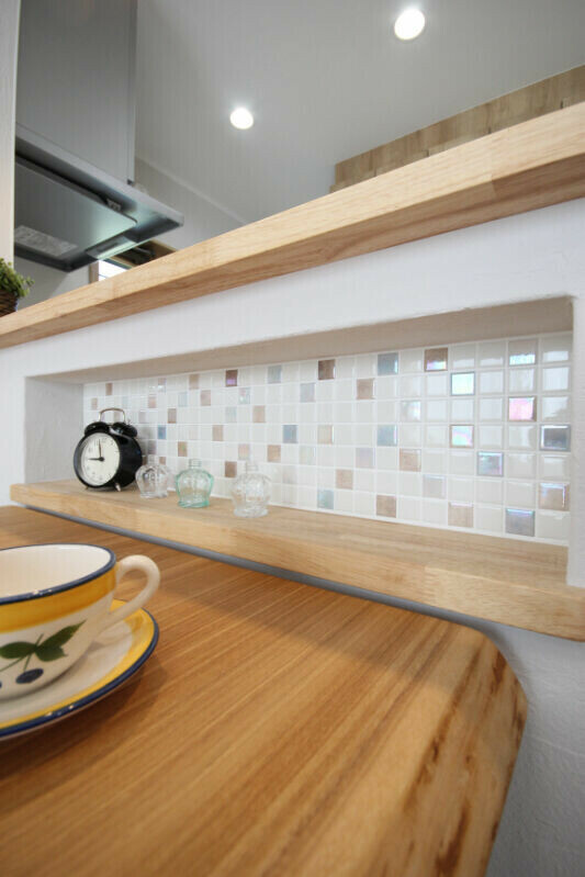 小物を置いて飾ったり調味料を置いたりなど、いろいろ活用できそうなスペース。優しい風合いの天然木を使ったニッチに、モザイクタイルを貼りました。