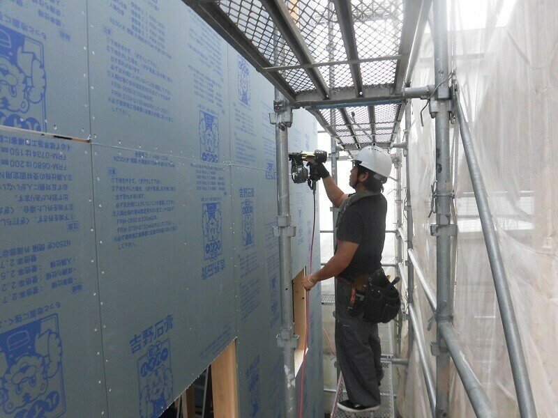 このEXハイパーですが、施工手順としてはまず寸法通りにカットして、それを外に運び出し、所定の位置に仮留めしたものを仕上げに釘打ち機で固定するという手順となります。
