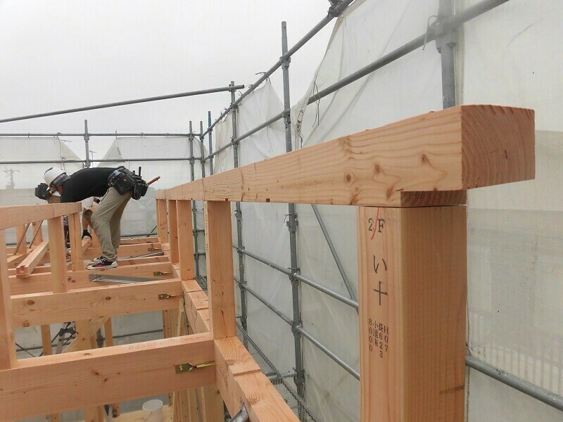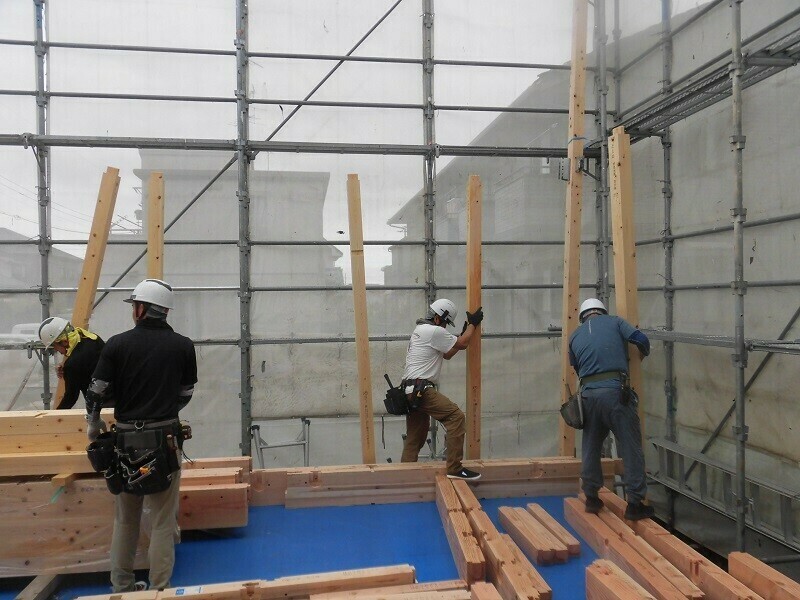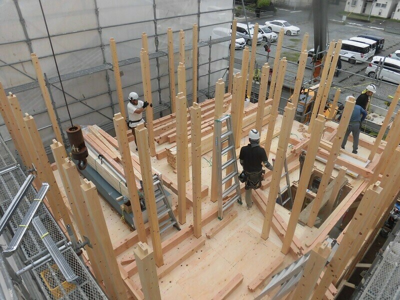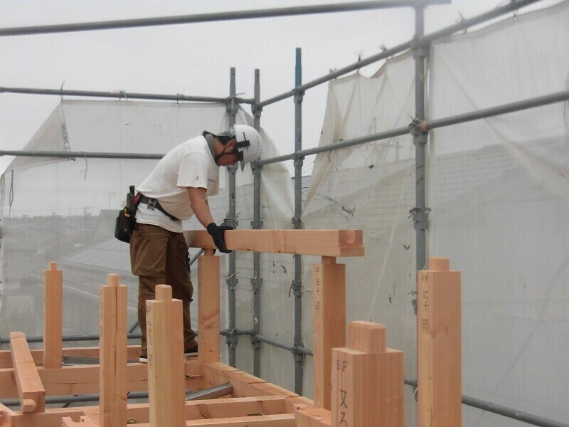 上棟日には柱や梁などの建物の基本構造となる部分の組み立て作業を大工さん数人掛かりで行います。