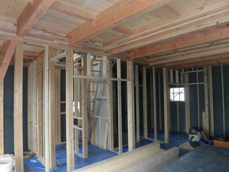 耐震上で必要となる筋交いや、間仕切壁の柱間の設置される間柱、建具上に付くまぐさ等、プレカットして現場納入された部材の取付作業も完了し、耐震金物の取付も終えることが出来ました。