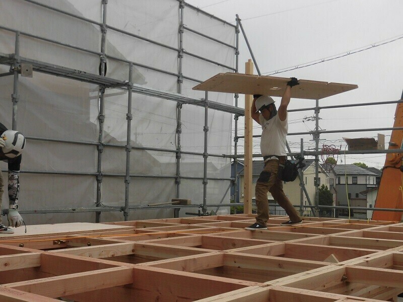 一時的に濡れてしまうのは仕方が無いにしても、雨に濡れてしまう状況を1週間も2週間も放置しておくのはやはり良くないので、2日目は耐力面材となる『EXハイパー』を張る作業を行うようにしています。