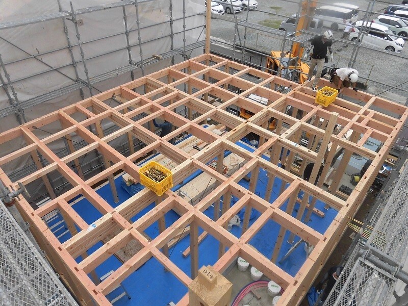 1階の梁が組み終わるとこんな感じに。