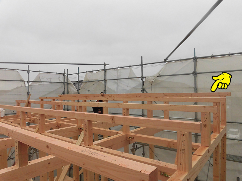 1寸勾配という緩やかな傾斜の屋根のお家は敷地に立った目線では棟木の様子が目視しにくいので、足場の上からの写真を1枚・・・。