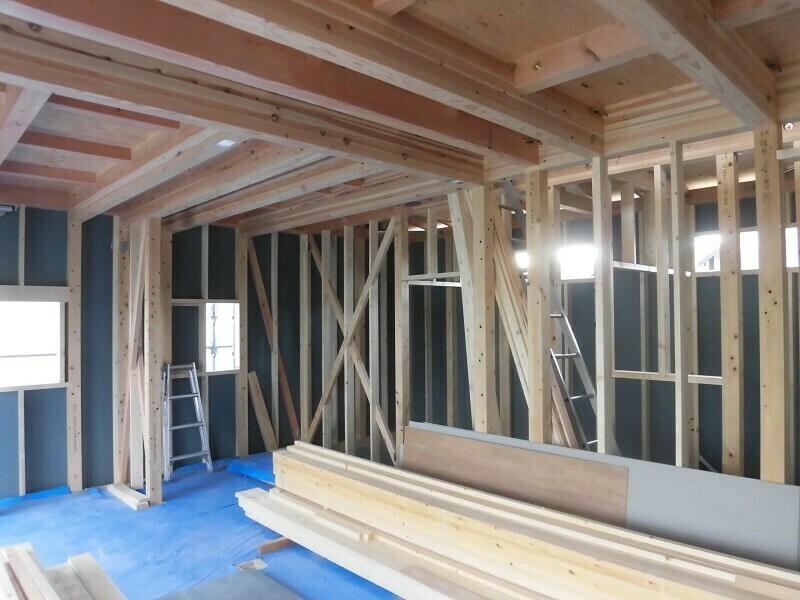 耐震上で必要となる筋交いや、間仕切壁の柱間の設置される間柱、建具上に付くまぐさ等、プレカットして現場納入された部材の取付作業も完了しました。