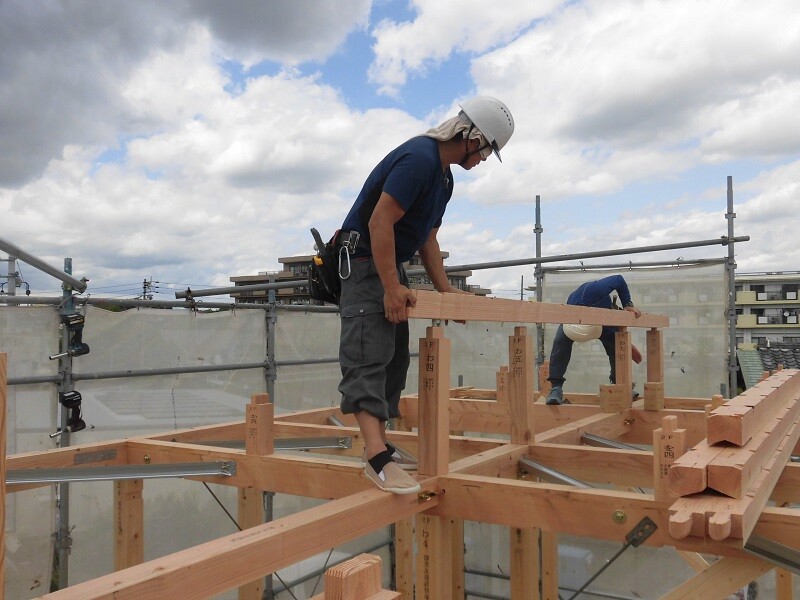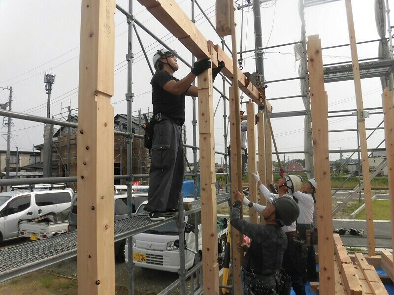 上棟日には柱や梁などの建物の基本構造となる部分の組み立て作業を大工さん数人掛かりで行います。