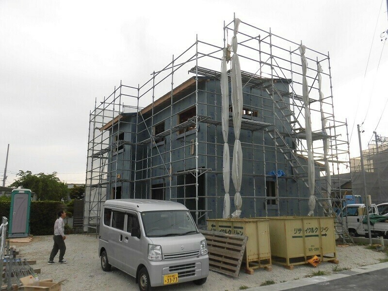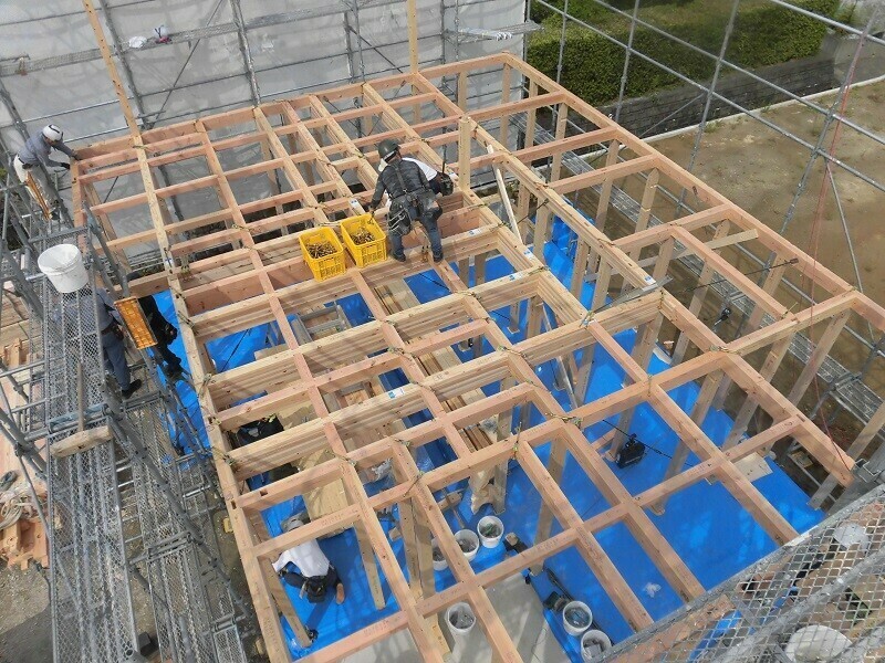 一時的に濡れてしまうのは仕方が無いにしても、雨に濡れてしまう状況を1週間も2週間も放置しておくのはやはり良くないので、2日目は耐力面材となる『EXハイパー』を張る作業を行うようにしています。