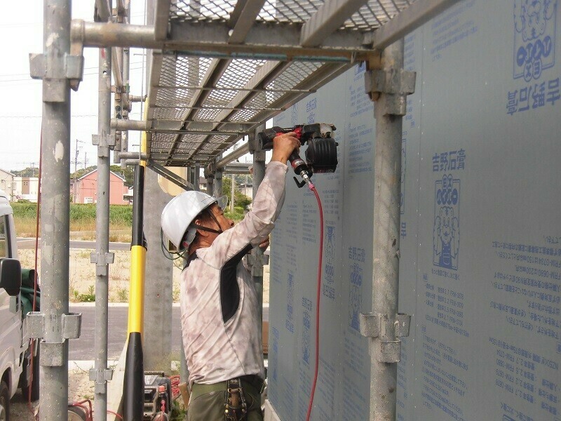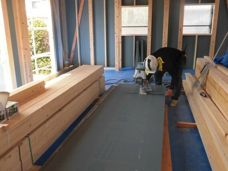 このEXハイパーですが、施工手順としてはまず寸法通りにカットして、それを外に運び出し、所定の位置に仮留めしたものを仕上げに釘打ち機で固定するという手順となります。