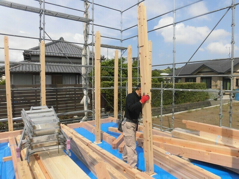 柱立てと言って、上棟日前日の天気が良ければ前もって1階分の梁を配り、柱を立てておく作業を済ませておきます。