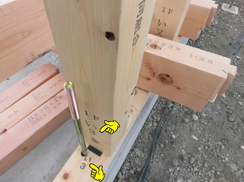・・・こんな感じで、『い3』の土台付近には『い3』の柱を立て、『い3』の印の付いた梁を配っておくわけです。