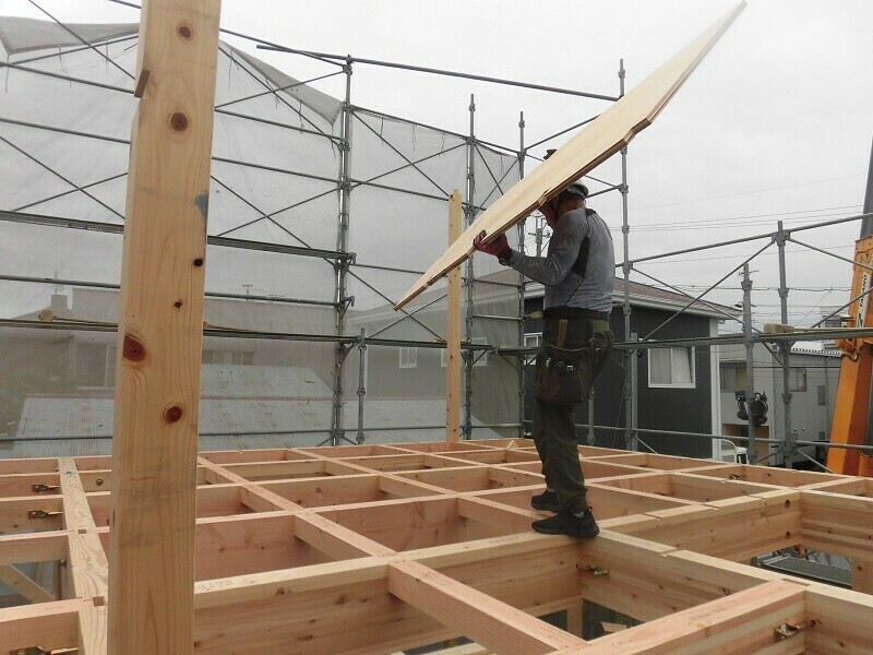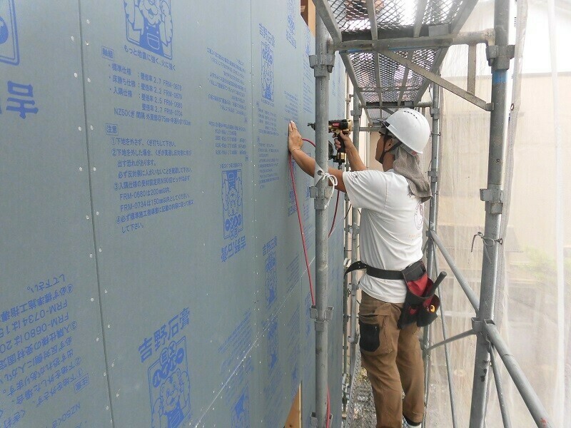 一時的に濡れてしまうのは仕方が無いにしても、雨に濡れてしまう状況を1週間も2週間も放置しておくのはやはり良くないので、2日目は耐力面材となる『EXハイパー』を張る作業を行うようにしています。