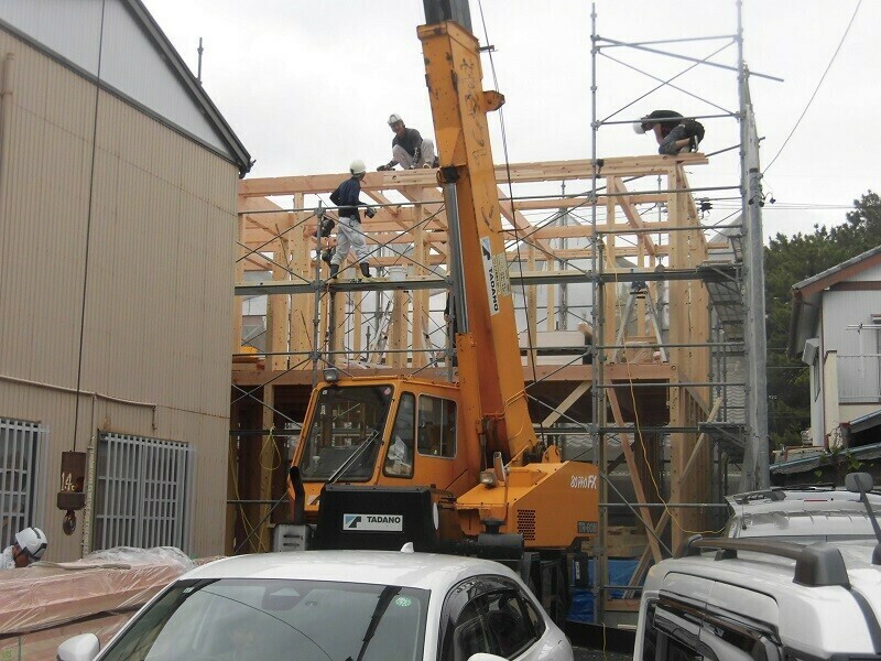 30分程度掛けて柱を立てると、レッカー屋さんと連携を取りながら柱のほぞを梁のほぞ穴にはめ込んでいきます。