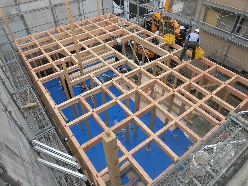 2階の梁を組み終えると、次の作業がいよいよ棟上げです。