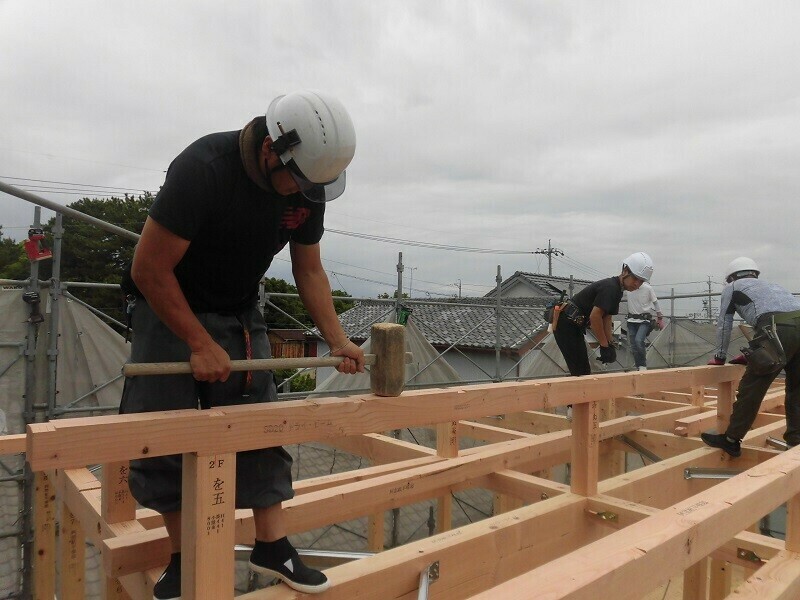 上棟日には柱や梁などの建物の基本構造となる部分の組み立て作業を大工さん数人掛かりで行います。