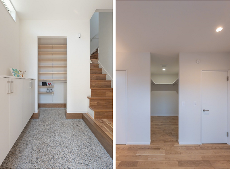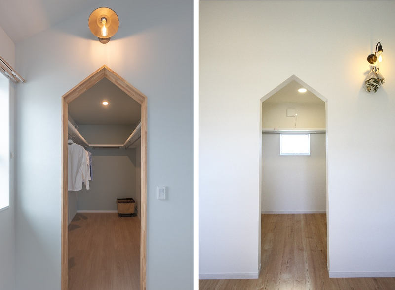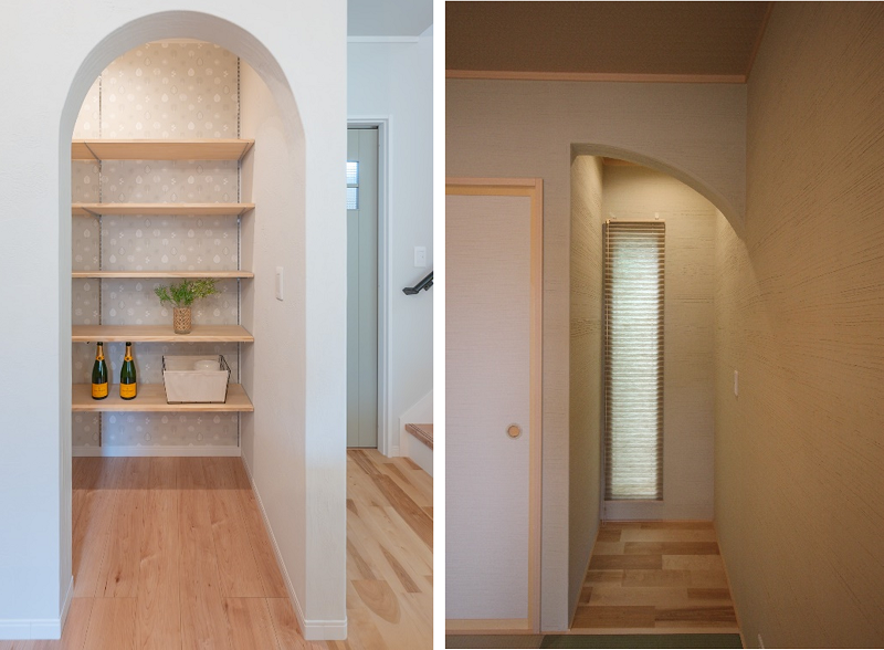 最近ではウォークインクローゼットやシューズクロークなど収納の入口は、建具を設けずに垂れ壁とすることが多く、その形状により受ける印象が変わってきます。