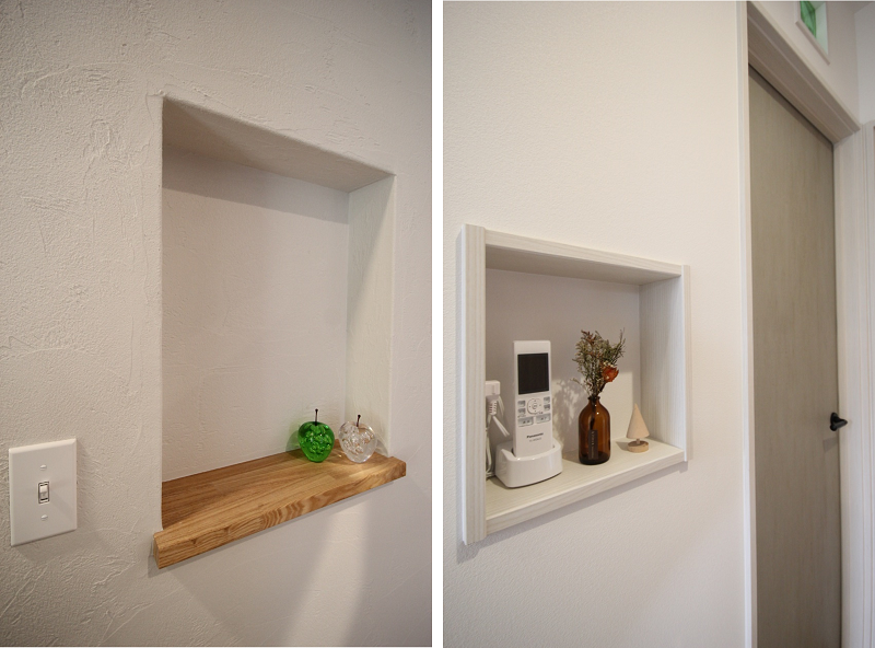 枠を設けた右のニッチの方が疵には強そうですが、左のニッチはより柔らかさというかナチュラル感というか、そんなものが感じられる可愛らしい仕上がりです。