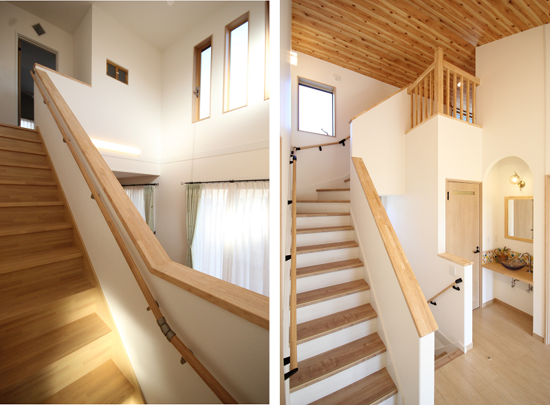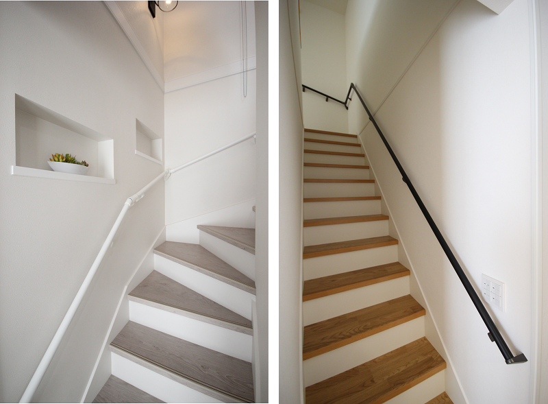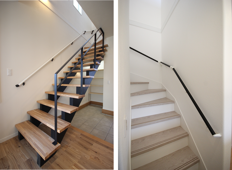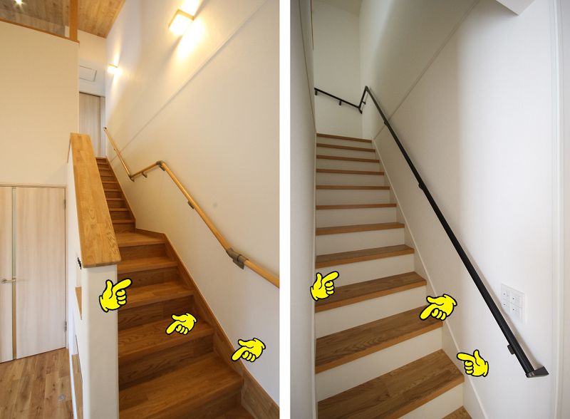 階段は実際に足で踏む部分の『踏板』、立ち上がり部分の『蹴込板』、壁との取り合いに用いる斜めの『側板』という部材で構成されていて、蹴込板と側板は踏板同色にするかホワイトにするか選択できます。
