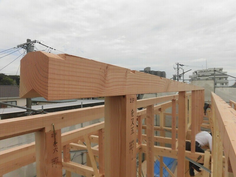 棟木というのは屋根の一番高いところに横たわって配置される木材のことを言い、O様邸の場合は画像の矢印部分、三角屋根のちょうど天辺に位置している木材がそれに当たります。