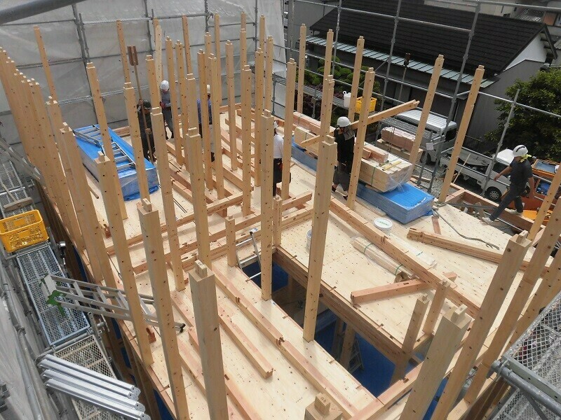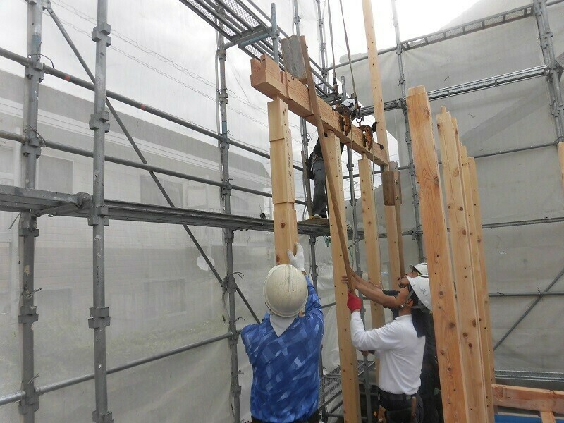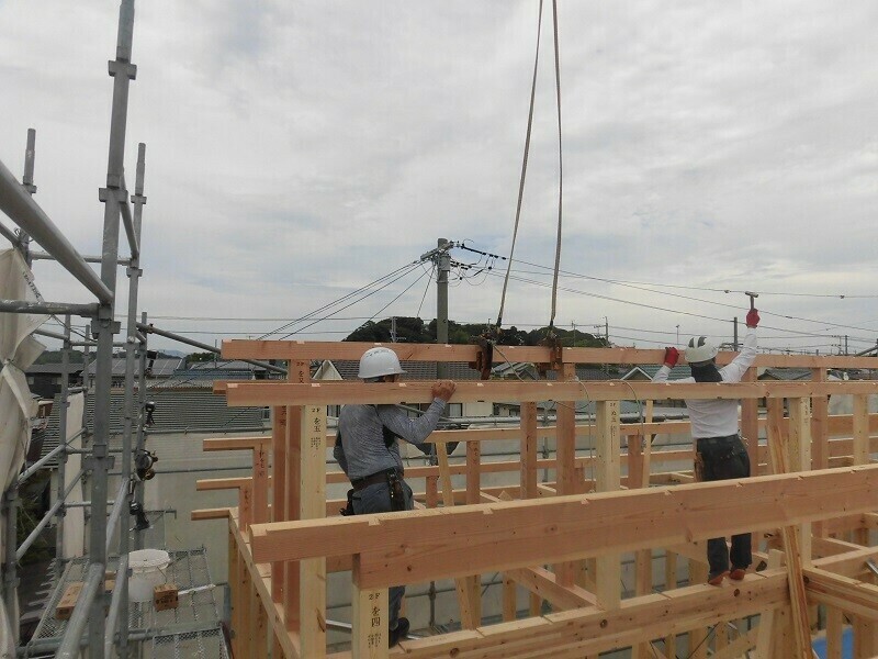 上棟日には柱や梁などの建物の基本構造となる部分の組み立て作業を大工さん数人掛かりで行います。