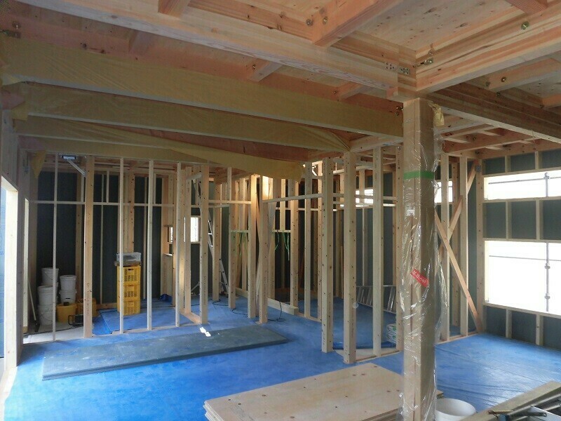 一時的に濡れてしまうのは仕方が無いにしても、雨に濡れてしまう状況を1週間も2週間も放置しておくのはやはり良くないので、2日目は耐力面材となる『EXハイパー』を張る作業を行うようにしています。