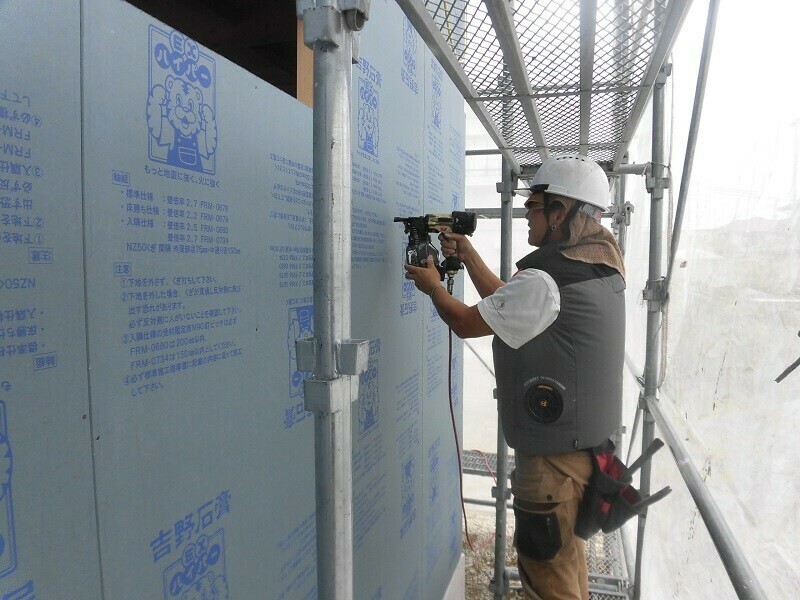 このEXハイパーですが、施工手順としてはまず寸法通りにカットして、それを外に運び出し、所定の位置に仮留めしたものを仕上げに釘打ち機で固定するという手順となります。