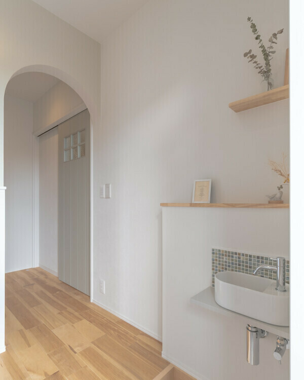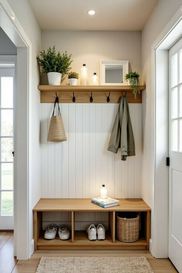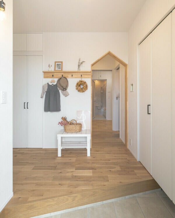 ちょっとした棚板やフックを取り入れるだけでも、玄関の雰囲気がぐっと変わり、気持ちまで整うような心地よさに。