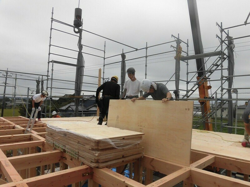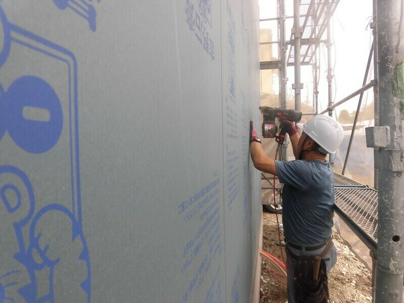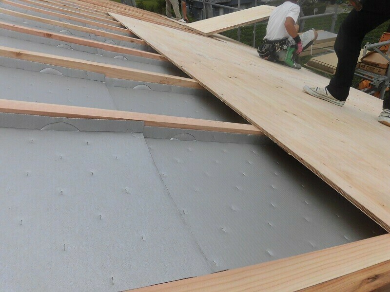 一時的に濡れてしまうのは仕方が無いにしても、雨に濡れてしまう状況を1週間も2週間も放置しておくのはやはり良くないので、2日目は耐力面材となる『EXハイパー』を張る作業を行うようにしています。