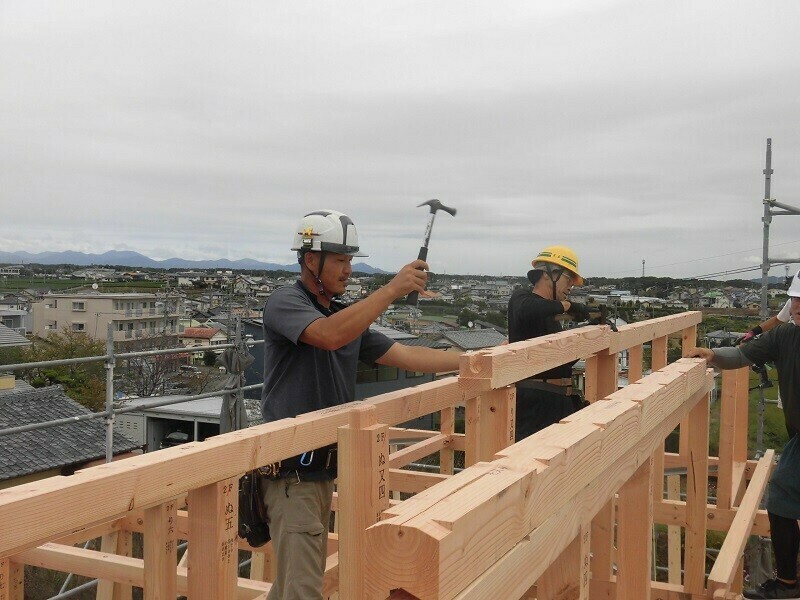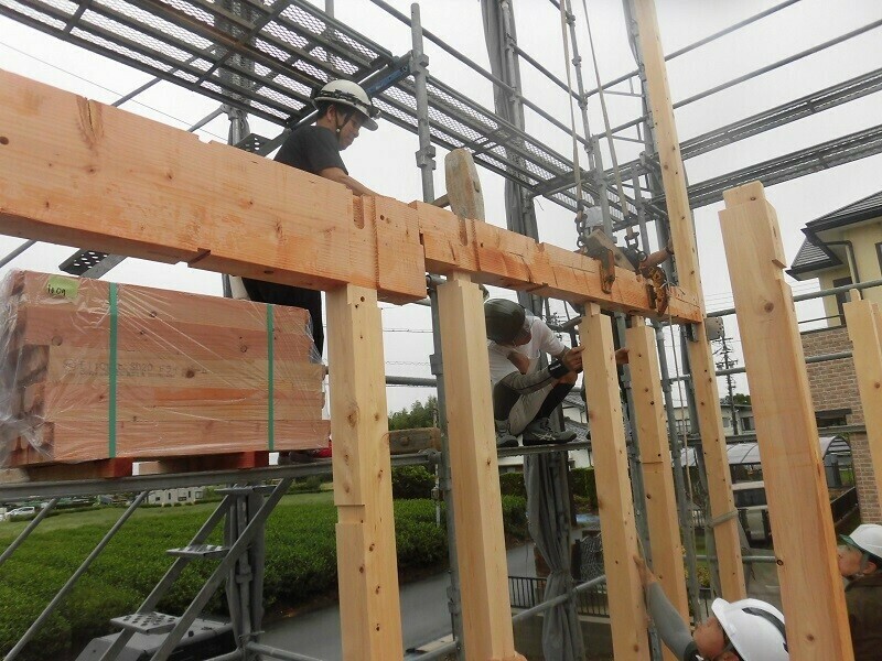 慣れないうちは梁の上を歩くのも結構怖いものですが、経験を積んだ大工さんにとってそれはお手の物。