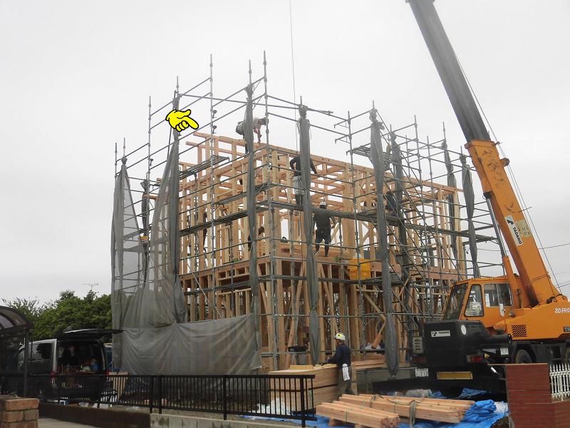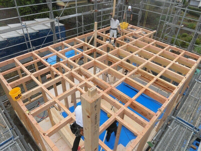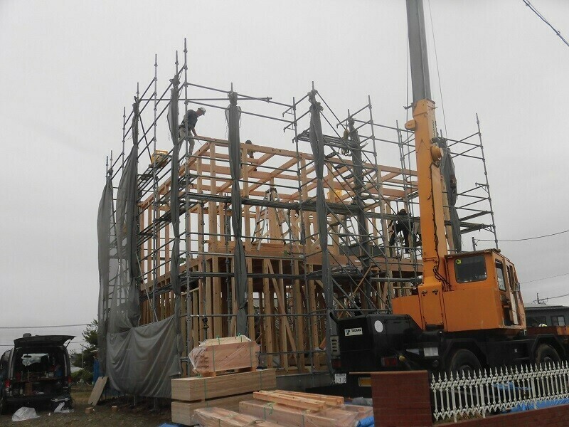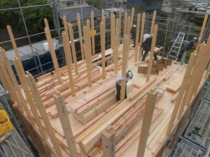 2階の梁を組み終えると、次の作業がいよいよ棟上げです。