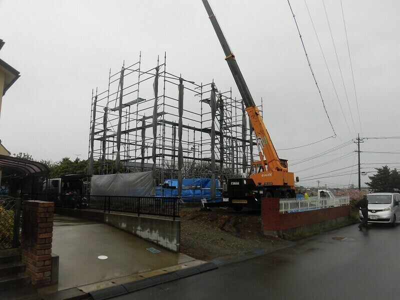 30分程度掛けて柱を立てると、レッカー屋さんと連携を取りながら柱のほぞを梁のほぞ穴にはめ込んでいきます。