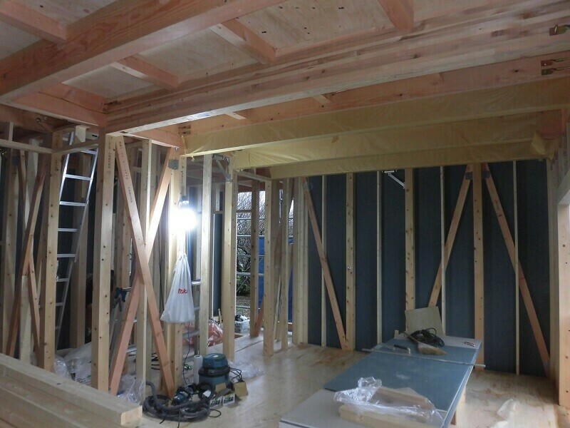 耐震上で必要となる筋交いや、間仕切壁の柱間に設置される間柱、建具上に付くまぐさ等、プレカットして現場納入された部材の取付け作業も完了し、更に角打ちと言って、入り隅(引っ込んだ角)に野縁を取付ける作業まで進みました。