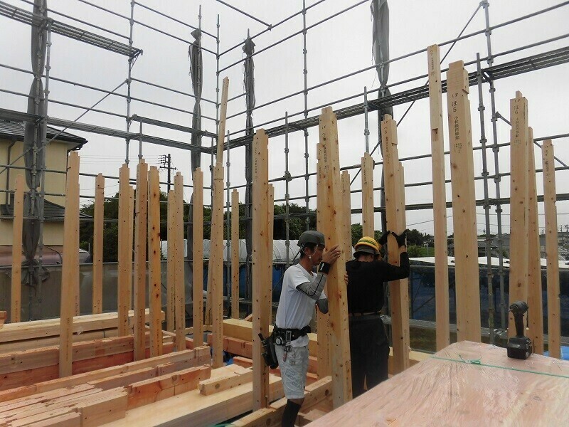 天候不順や大工さんの都合もあり1階の柱を立てておくことが出来なかったので、この日の作業は1階の柱を立てていくところから始めました。