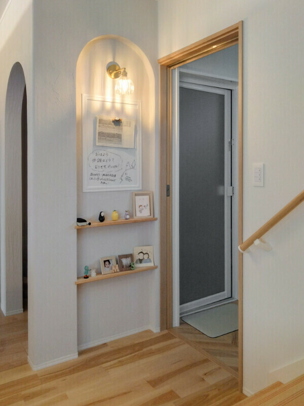 壁にはお気に入りのリースや小物が飾られ、訪れる人や帰ってきた家族をあたたかくお出迎え。