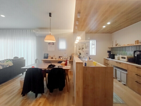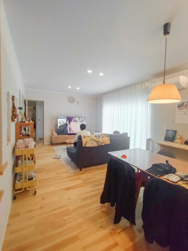 木のぬくもりに包まれたLDKには、家族の写真やお気に入りの雑貨が並び、あたたかくやさしい空気が流れていました。