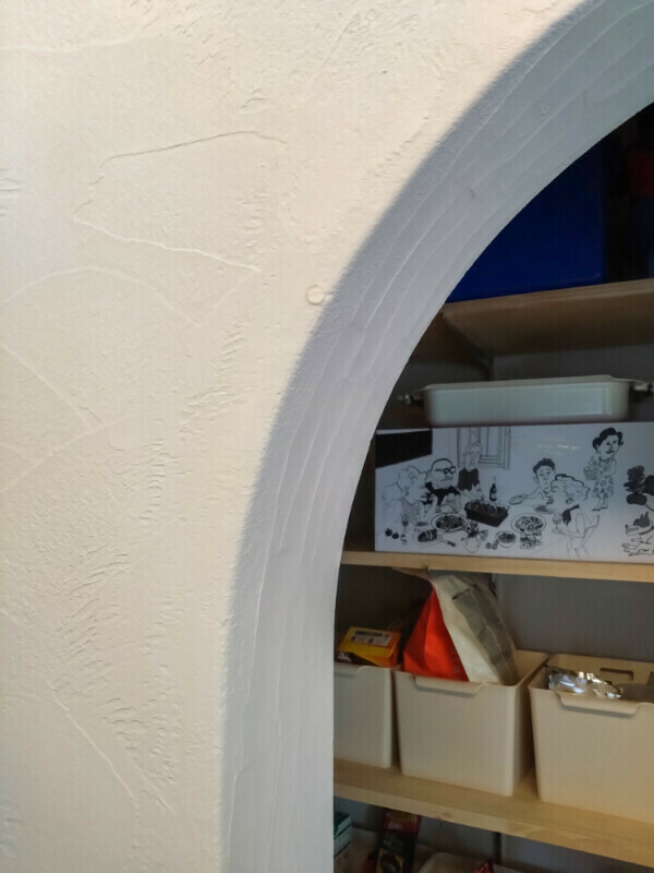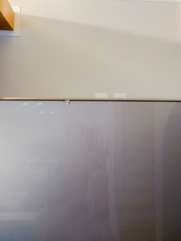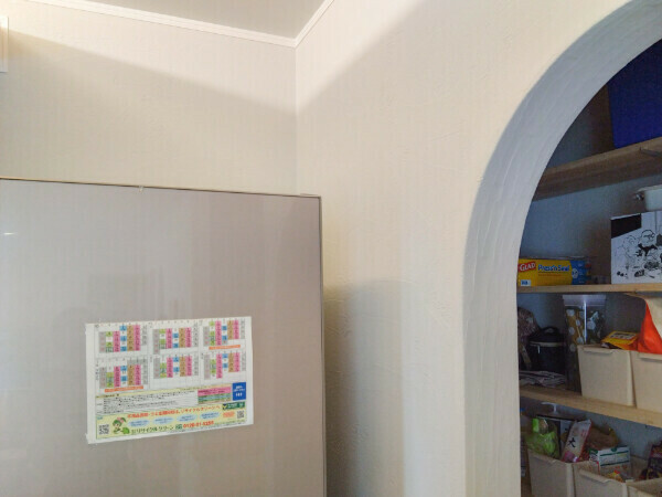 実はこれ、冷蔵庫を開けた際に扉とシラス壁(塗り壁)との接触を防ぐために、衝撃防止用のクッションシールを貼られたとの事。