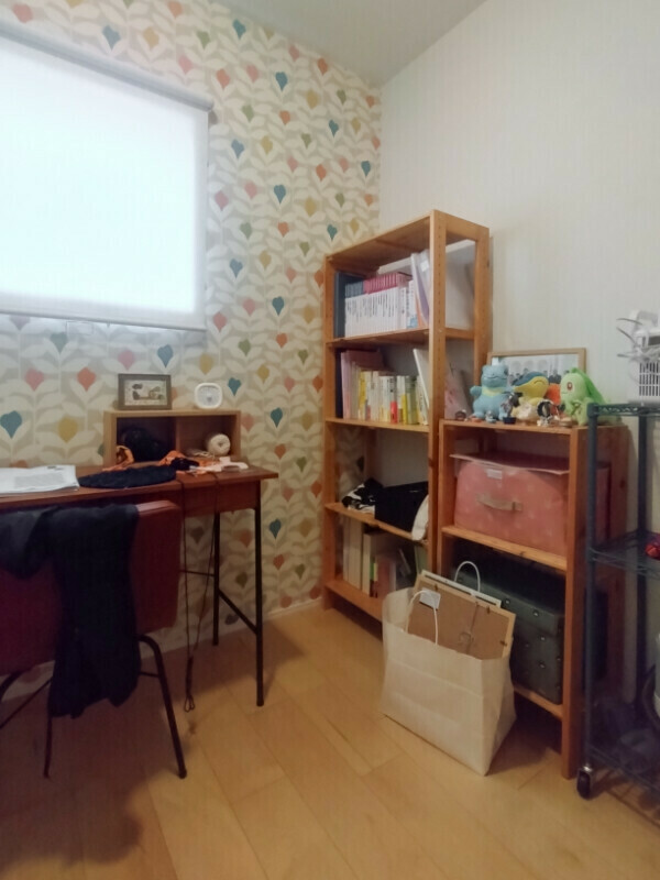 可愛らしい北欧柄のアクセントクロスが印象的な書斎。