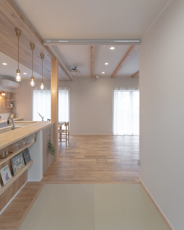 リビングに隣接した畳コーナーは、家事・くつろぎ・子どもの遊び場として使いやすい位置。自然と家族が集まる万能スペースです。