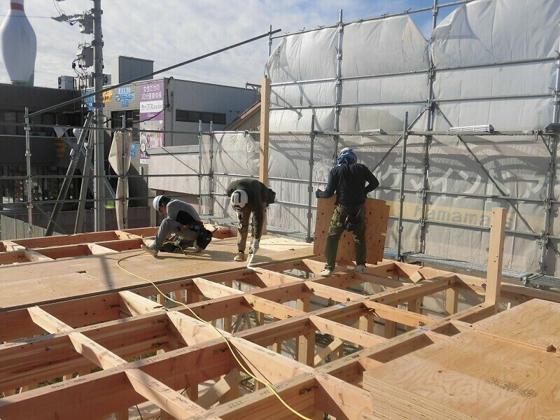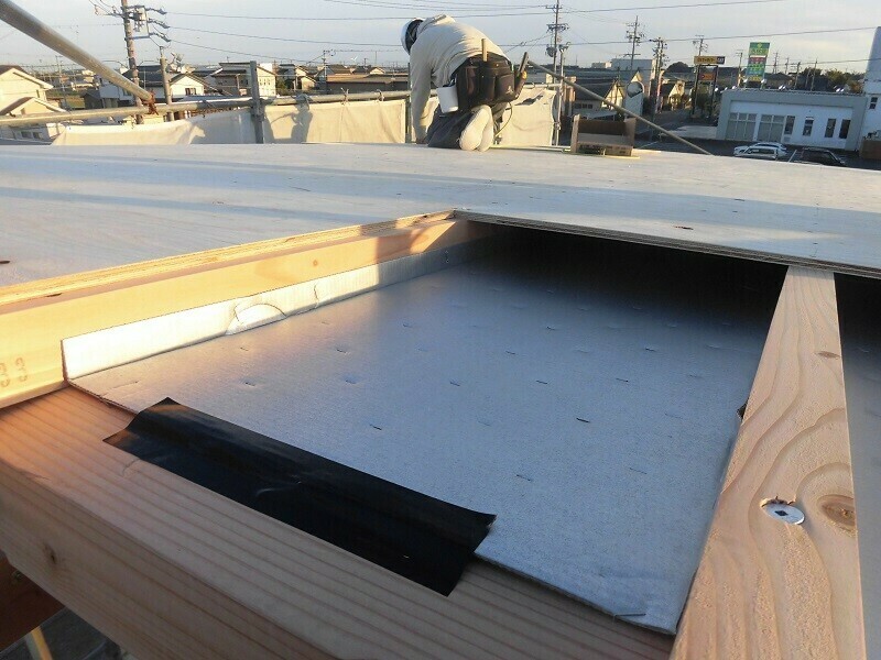 一時的に濡れてしまうのは仕方が無いにしても、雨に濡れてしまう状況を1週間も2週間も放置しておくのはやはり良くないので、2日目は耐力面材となる『EXハイパー』を張る作業を行うようにしています。