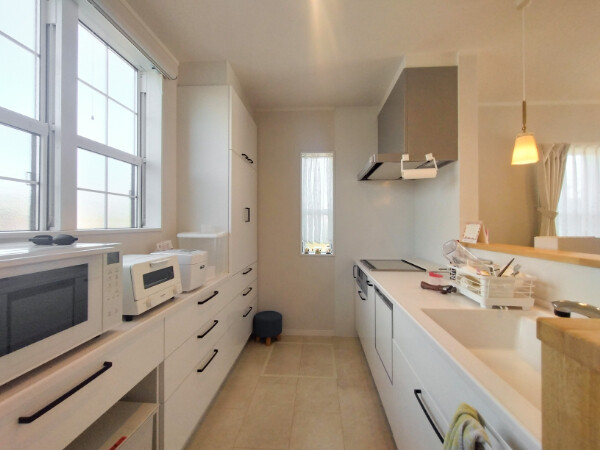 とてもすっきりとしたキッチン。家電もすべて白で統一されています。