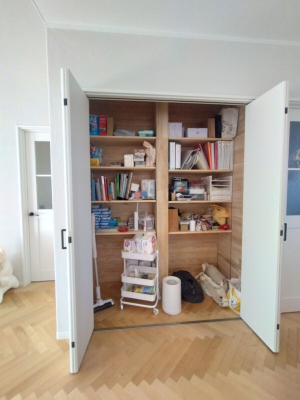 奥行のある収納で、書類から日用品までたっぷり収まっています。リビング収納の参考になりますね。