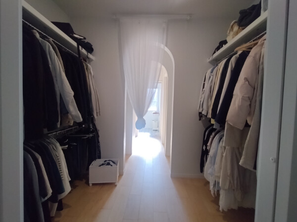 脱衣室からクローゼットへ一直線につながるアーチ垂れ壁と、そこから差し込むやさしい光…。