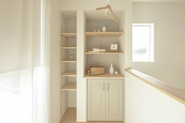 壁の幅や高さぴったり合わせた収納棚やキッチン横の造作カウンター、階段下を活かした収納など、デッドスペースになりがちな場所も有効活用できます。