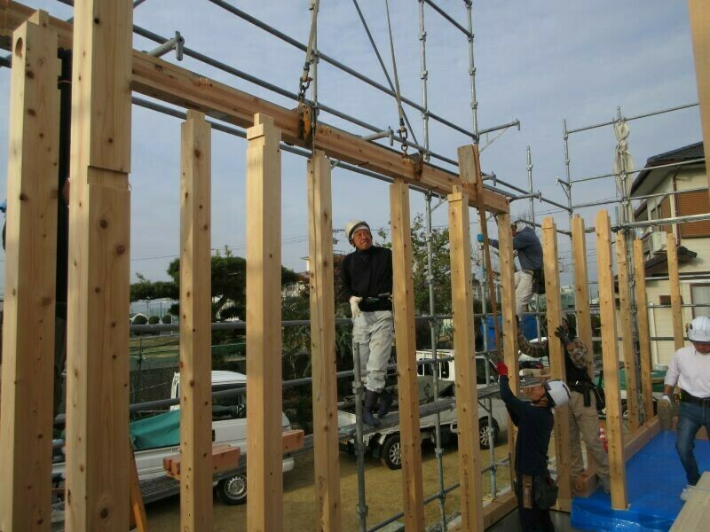 レッカー屋さんと連携を取りながら柱のほぞを梁のほぞ穴にはめ込んでいきます。