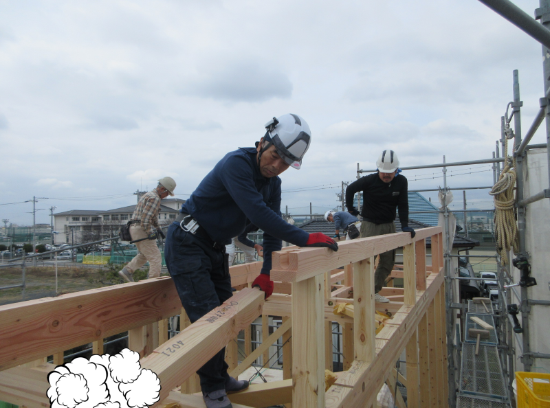 上棟日には柱や梁などの建物の基本構造となる部分の組み立て作業を大工さん数人掛かりで行います。