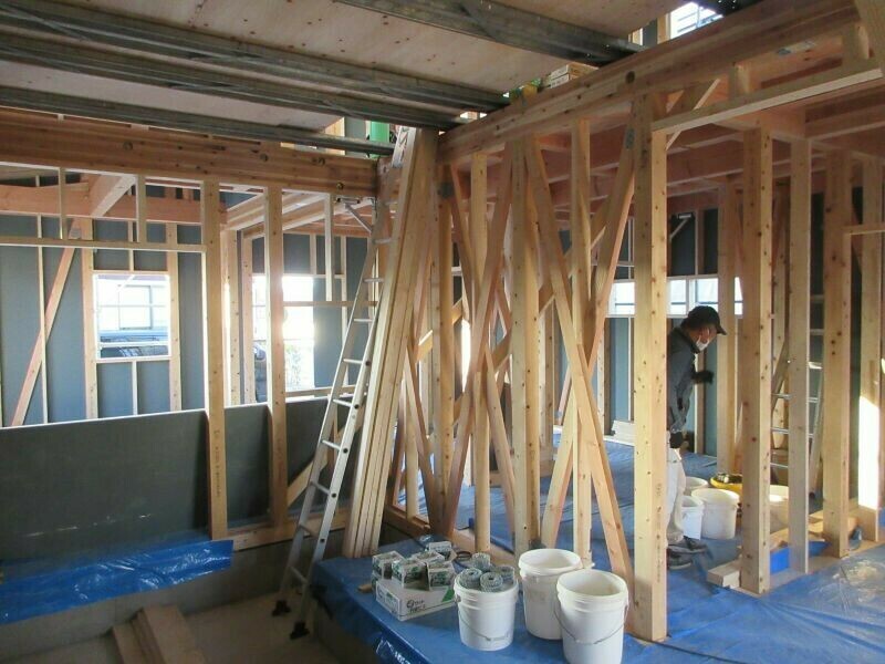 耐震上で必要となる筋交いや、間仕切壁の柱間に設置される間柱、建具上に付くまぐさ等々・・・プレカットして現場納入された部材と耐震金物の取付作業を9割方完了するところまで進めることが出来ました。