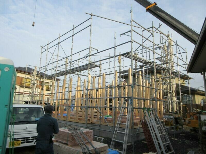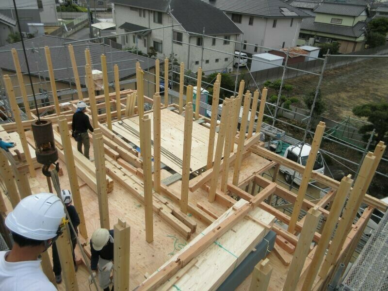 柱立てと言って、上棟日前日の天気が良ければ前もって1階分の梁を配り、柱を立てておく作業を済ませておきます。