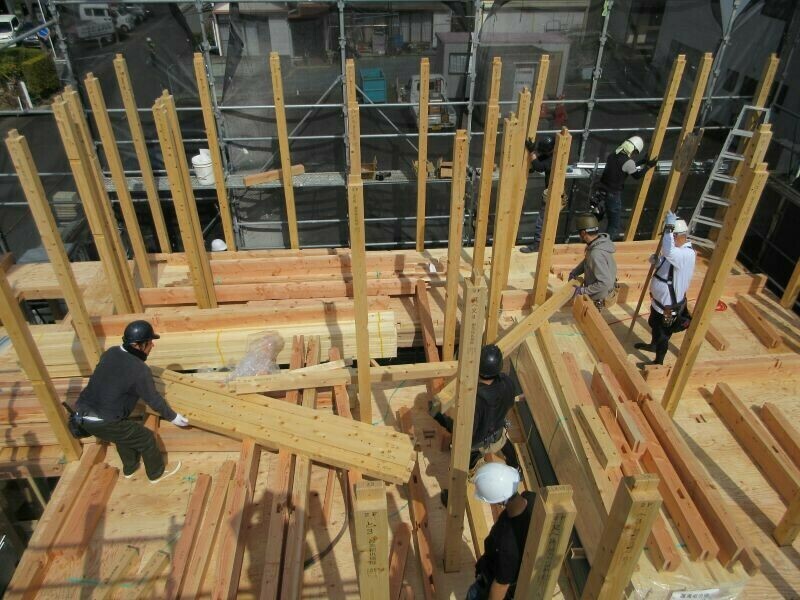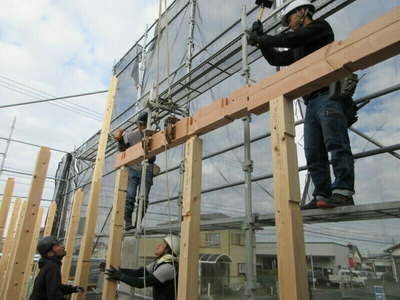 上棟日には柱や梁などの建物の基本構造となる部分の組み立て作業を大工さん数人掛かりで行います。