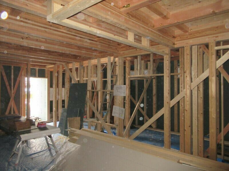 耐震上で必要となる筋交いや、間仕切壁の柱間の設置される間柱、建具上に付くまぐさ等々・・・プレカットして現場納入された部材の取付作業を完了させることが出来ました。